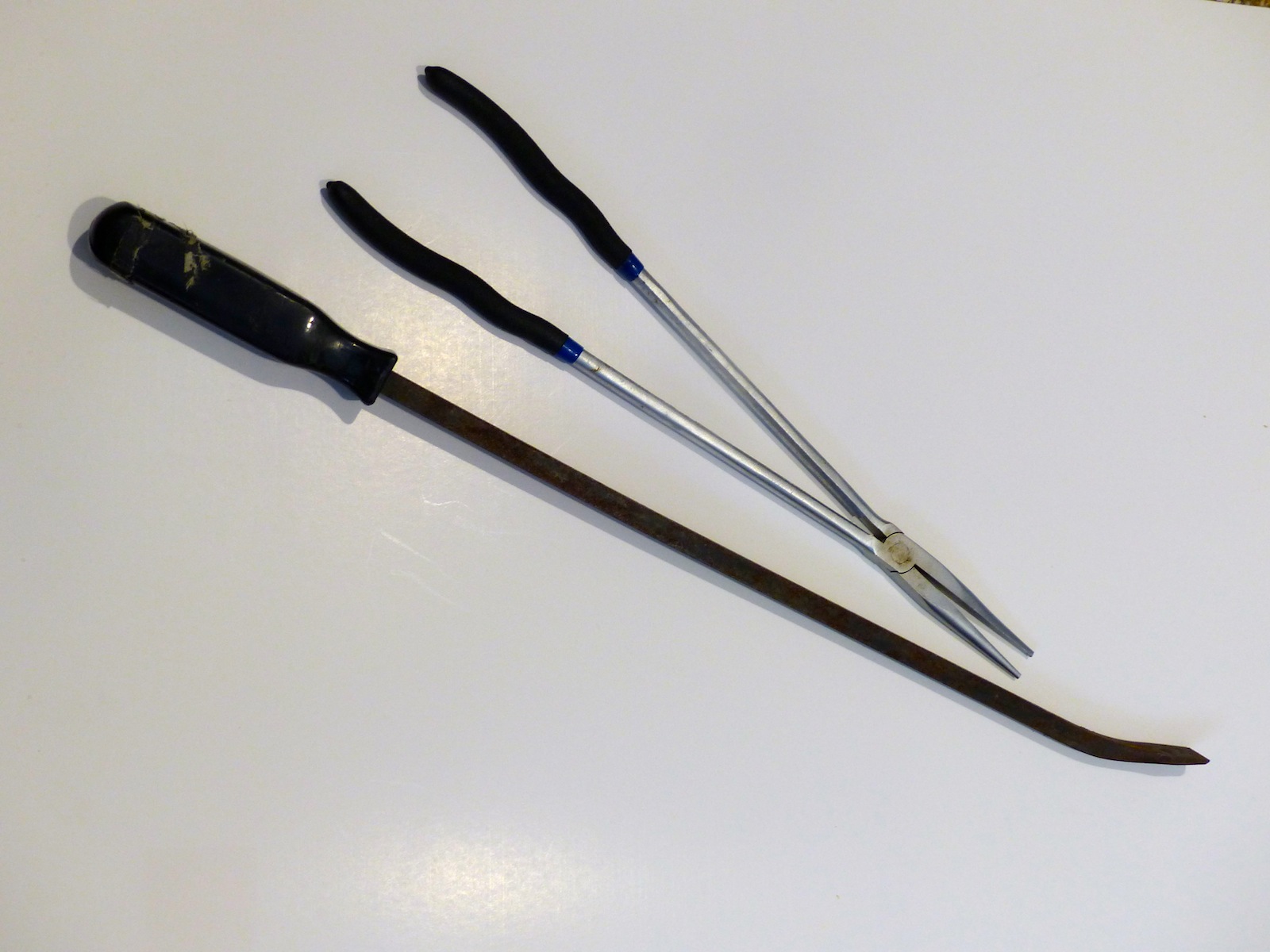 For weeds or rope stuck in the exterior of the grate, a strong sharp knife and a pair of pliers will probably do the trick. Sometimes this operation can be done under water (tie the tools around your wrist in case they slip out of your hand). But it’s easier (and safer with the knife) to do it when the unit is beached and tipped on its side. For anything inside the grate, you will need needle nosed forceps and a long narrow pry bar. If none of this works, you’ll need to carry a properly sized socket wrench to remove the grate to more easily access the problem. Both tools are available at local automotive supply stores.
