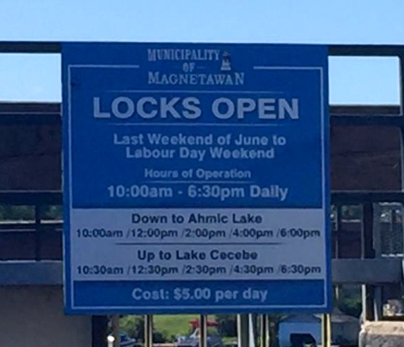 As you can see, the lock dates and times are somewhat limited at the Magnetawan Lock. This isn’t unsurmountable if you plan ahead to arrive just before one of the posted lock thru times. This will give you about two hours to explore Ahmic Lake and have lunch before the return lock thru is available.
