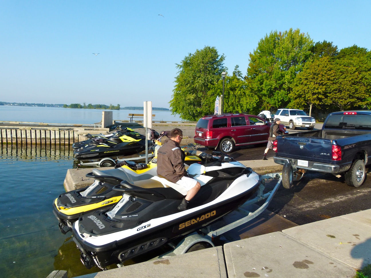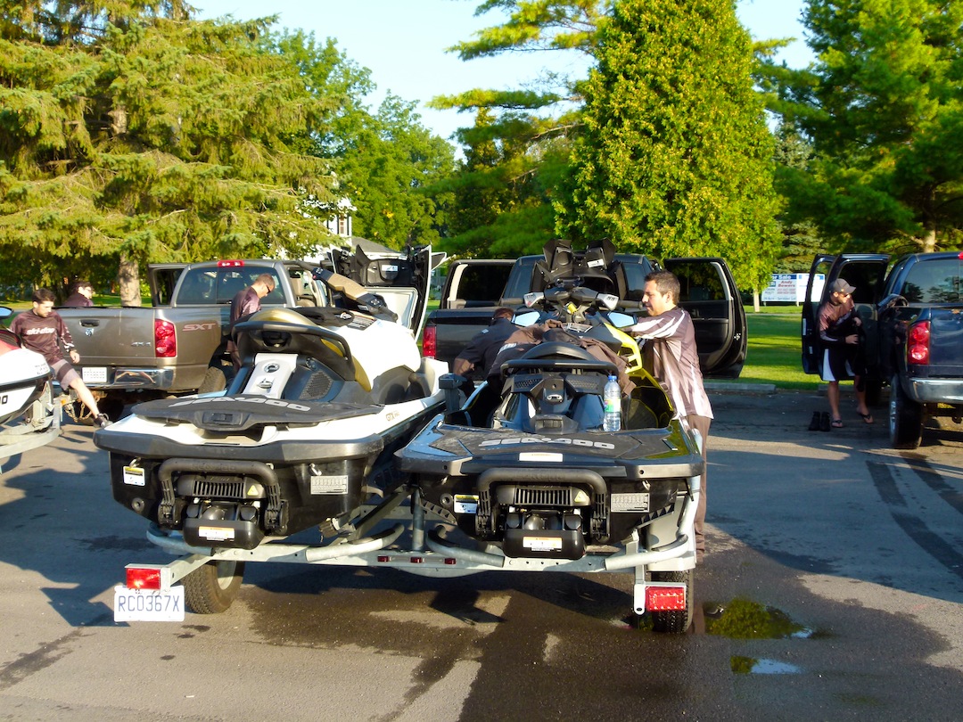 Towing and launching Sea Doo watercraft is easy for either experienced jet ski riders or PWC beginners. In fact, it hardly feels like I’m towing a PWC Triton trailer on Sea Doo tour or other PWC adventures riding a Sea Doo, jet ski or waverunner personal watercraft in Ontario. Neither one or two-bed PWC Triton trailers restrict rearward sight lines like towing a large boat or snowmobile trailer does. And I can keep an eye on the jet skis and covers with my rearview mirrors.