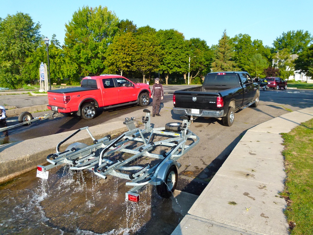 Go slow and easy at every launch. Having burst a tire pulling out too fast and seen one guy drop his improperly secured jet ski on a concrete ramp (ouch!) when the PWC trailer jerked ahead, I’ve learned that easing into and out of the water slowly is a much safer way to go. So learn from my Sea Doo trailering mistakes!