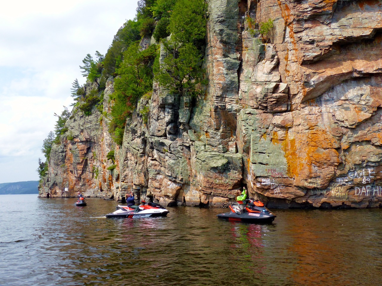This upper Ottawa River Sea Doo Tour Video shows that with Ontario on one side and Quebec on the other, the upper Ottawa through to Lake Temiskaming can best be described as Canada’s “God’s Country”. On our Sea Doo, jet ski and waverunner watercraft adventures, we were certainly in awe Sea Doo riding by majestic shores, largely uninhabited and bounded by breathtaking hills, imposing rock faces and dense forests right down to the waterline. The upper Ottawa River is navigable, deep and wide, sweeping in gentle curves through the same beautiful wilderness that Champlain experienced four centuries ago. I swear the ghosts of voyageurs were paddling along beside us!